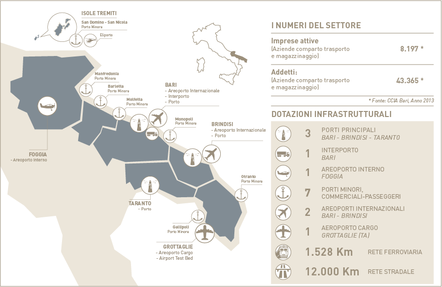 Il sistema logistico pugliese è composto da una rete strategica di collegamenti, caratterizzata da una sempre più efficiente intermodalità tra collegamenti stradali, ferroviari, portuali e aeroportuali. La posizione geografica di porta per l’Europa verso i Paesi dell’area del Mediterraneo e dei Balcani e gli 865 km di costa sono ulteriori elementi che da sempre favoriscono i contatti e gli scambi culturali e commerciali.