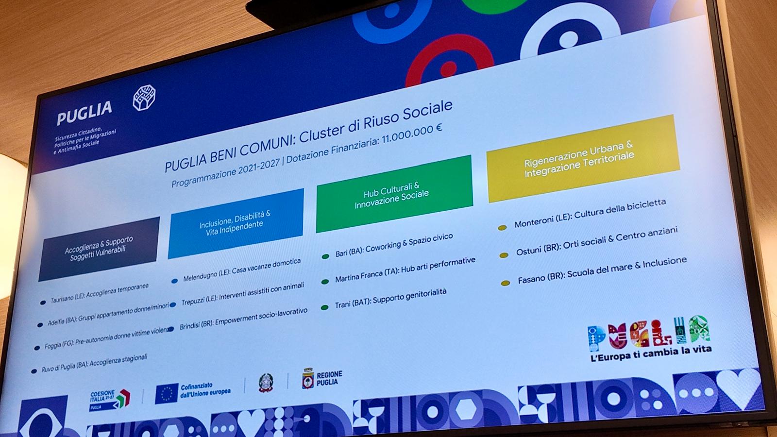 Martina Franca sarà realizzato un hub dedicato alle arti e all’innovazione sociale giovanile; a Fasano un progetto legato alla blue economy e all’inclusione sociale; a Trani un centro per il supporto alla genitorialità e alla mediazione familiare; a Brindisi una struttura multifunzionale per l’inclusione lavorativa e sociale delle persone fragili.