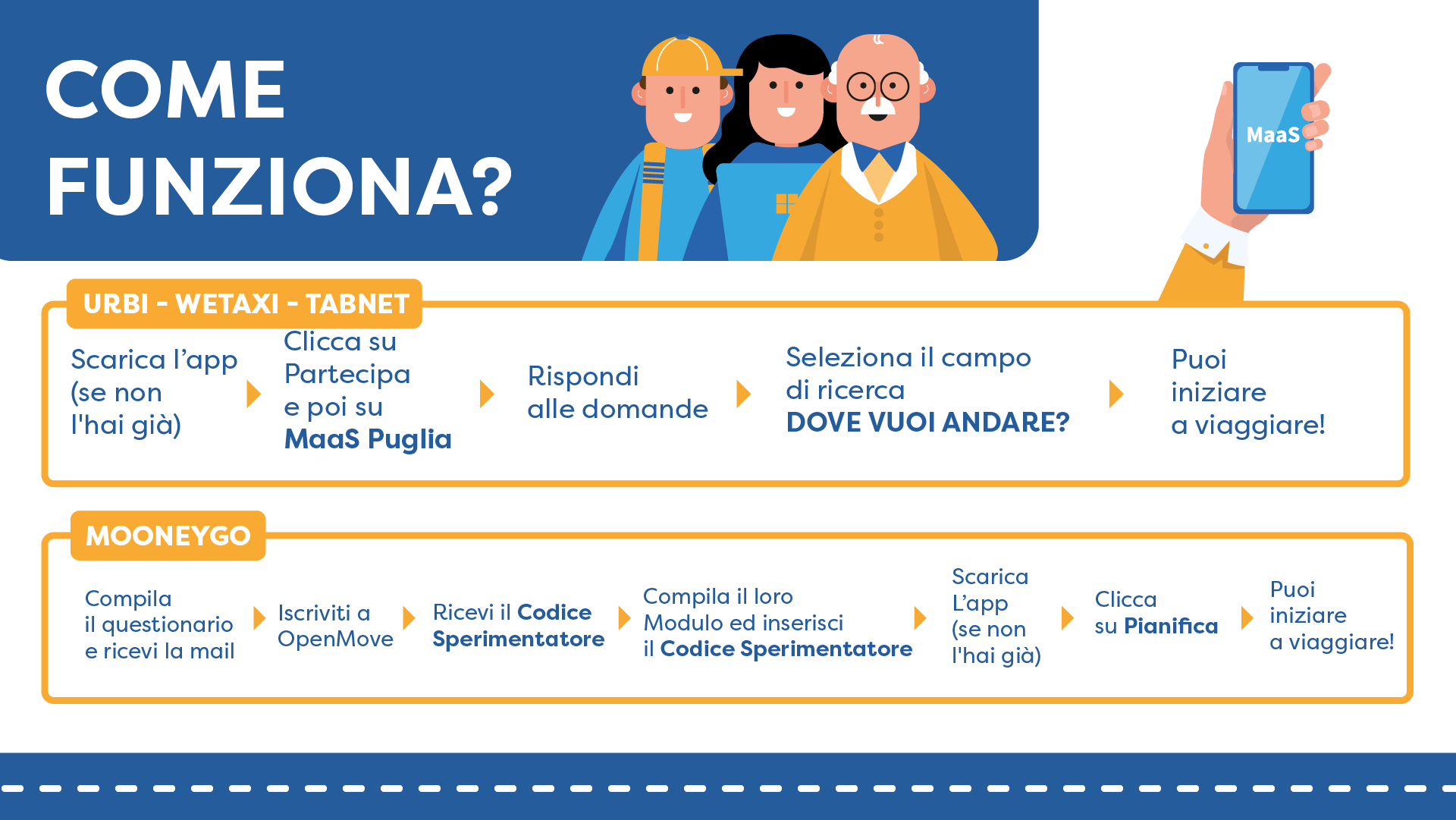 Con il MaaS, gli utenti possono accedere a un’unica piattaforma  (le app dei MaaS Operator: MooneyGo, Urbi, Tabnet, WeTaxi) attraverso il proprio smartphone, beneficiando di una vasta gamma di funzionalità e di un sistema di pagamento unico.