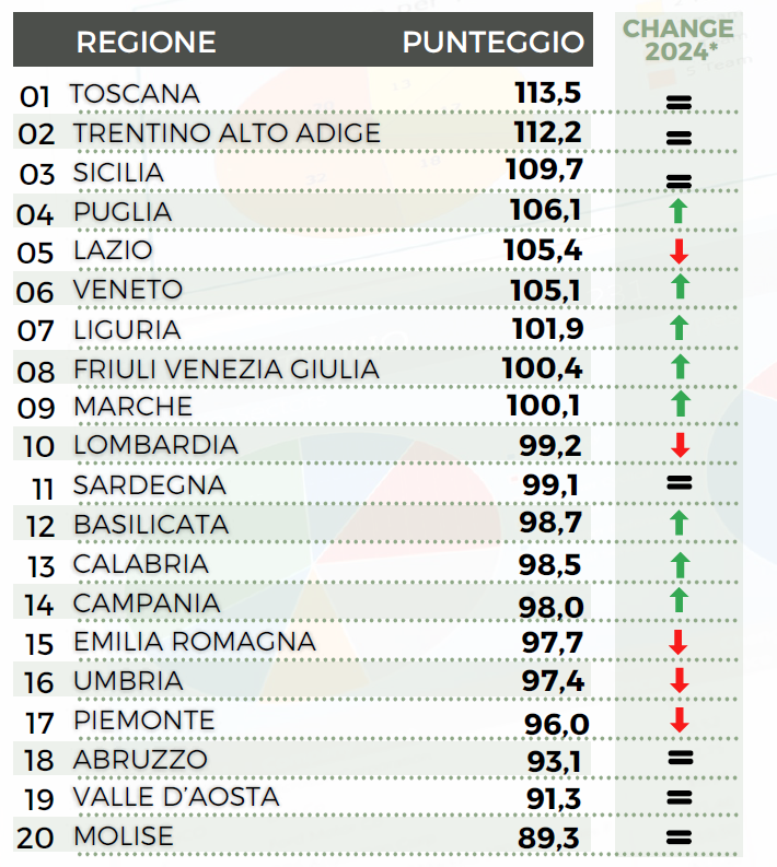 Nel 2025 la Puglia si colloca al quarto posto nella graduatoria nazionale dell’indice, con un punteggio pari a 106,1, preceduta da Toscana (113,5), Trentino-Alto Adige (112,2) e Sicilia (109,7).